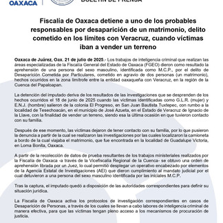 Oaxaca de Juárez, Oax. 21 de julio de 2025.- Los trabajos de inteligencia criminal que realizan las áreas especializadas de la Fiscalía General del Estado de Oaxaca (FGEO) dieron como resultado la aprehensión de una persona del sexo masculino, identificada como M.C.P., por el delito de Desaparición Cometida por Particulares, cometido en agravio de dos personas (un matrimonio), hechos ocurridos en la zona limítrofe entre la entidad oaxaqueña con Veracruz, en la región de la Cuenca del Papaloapan.