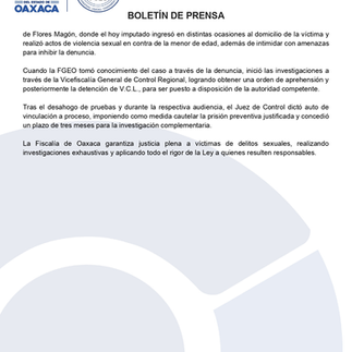 En un segundo caso, la FGEO obtuvo la vinculación a proceso en contra de V.C.L., imputado por el delito de violación, cometido en agravio de una adolescente de identidad reservada de 17 años de edad.
